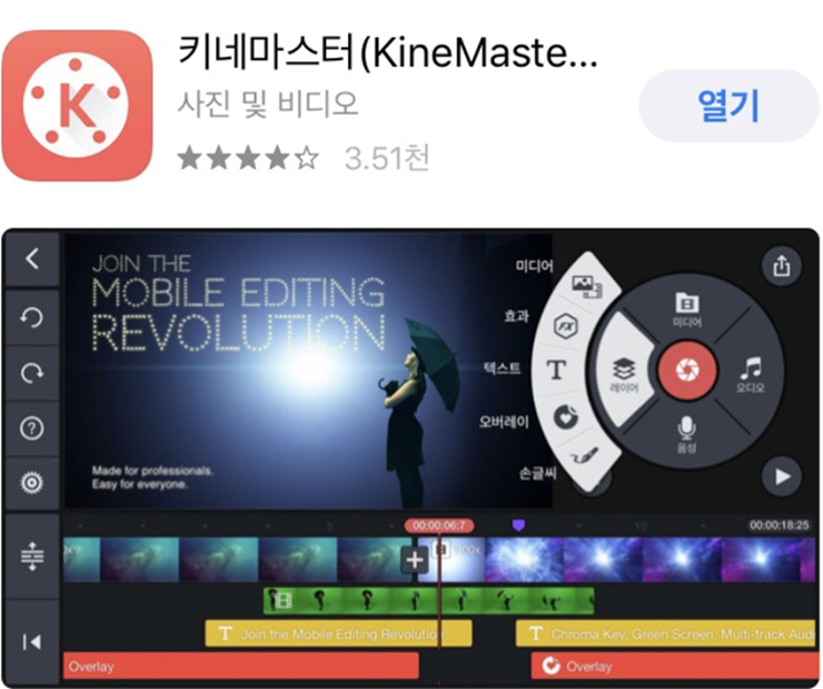 play 스토어에서 키네마스터 어플을 깔아주세요. 가격은 무료입니다. 워터마크를 없애거나 새로운 음악 및 에셋을 이용하고 싶을 땐 월 5000원, 년 40000원의 가격에 유료로도 사용 가능해요.
