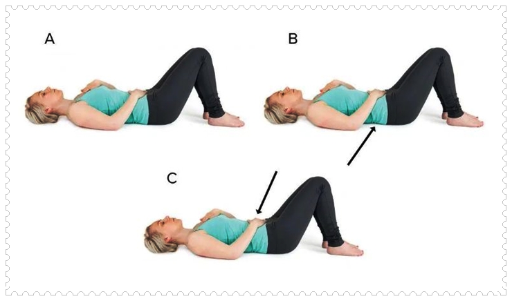 +숨을 내쉬면서 배꼽을 척추쪽으로 당기고 복부 근육을 조이고 엉덩이를 가만히 유지합니다.