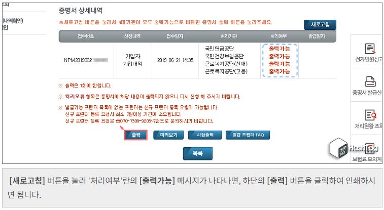 그러면 새 창이 열리고 자동으로 입력될 창이 아닌 다른 창을 선택한 후 하단에 있는 신청 단추를 클릭 합니다. 인증서 발급 신청은 다소 시간이 걸릴 수 있으므로 안내 팝업 창을 닫고 인증서 출력가능 표시가 나타날 때까지 기다려 주십시오. 그런 다음 새로고침을 눌러 출력이 표시되면 아래 출력 버튼을 클릭하여 출력을 완료합니다.