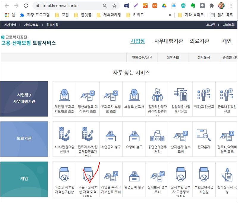 클릭하시면 사이트로 이동합니다. 복잡한 메뉴 구조는 다양한 서비스가 제공되기 때문에 영적으로 거칠다. 그래도 메뉴를 바로 찾지 못하고 길을 잃는 경우를 위해 메인 페이지에서 자주 신청되는 서비스만 모아두었습니다. 사업영역은 크게 사업체 또는 사무대행, 의료기관, 개인의 세 가지로 나눌 수 있습니다. 고용보험 이력 조회는 개별 파트의 '고용재해보상보험 이력서' 메뉴를 클릭하면 된다.
