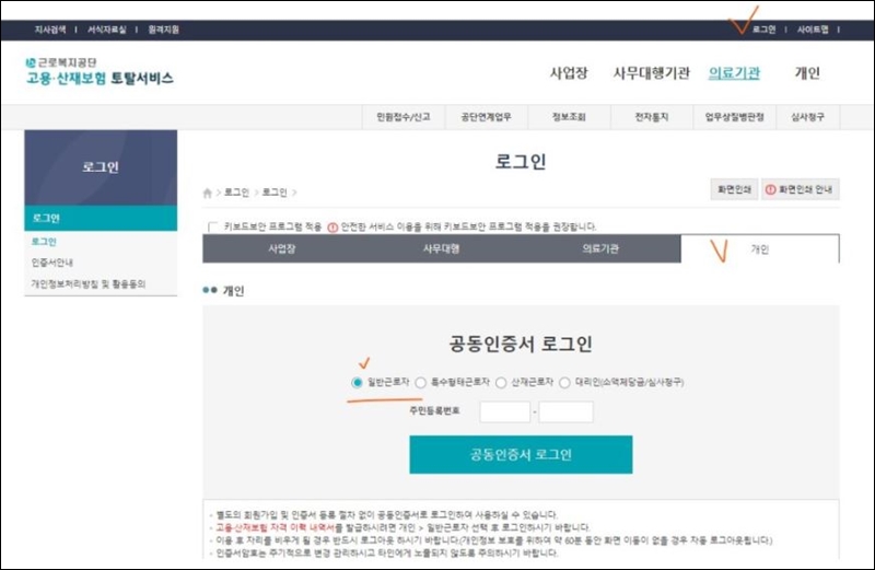 여기서 조금 조심해야 합니다. 공동인증으로 로그인하는 방법은 각 사무소, 사무소, 의료기관, 개인의 4가지로 나뉘며, 이 4가지를 다시 그 범주 내에서 세분한다. 오늘은 개인 문서이기 때문에 개인 탭을 사용하고 있습니다. 일반근로자는 특수근로자, 산재근로자이며 대리인인 나는 일단 정규직으로 선발된다. 마지막으로 인증서를 선택하고 결정한 비밀번호를 입력합니다.