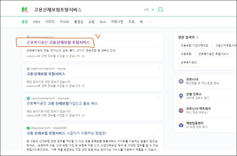 네이버에서 "고용재해보상보험 토탈서비스"를 입력하여 검색하세요. 그 후 결과 상단에 "근로복지공단 고연산보험종합서비스"가 나오는데, 오늘 사용할 곳이 적당한 곳입니다. 한국근로자보상공단 홈페이지와 별도로 운영되고 있으니 부담 없이 이용하시기 바랍니다.