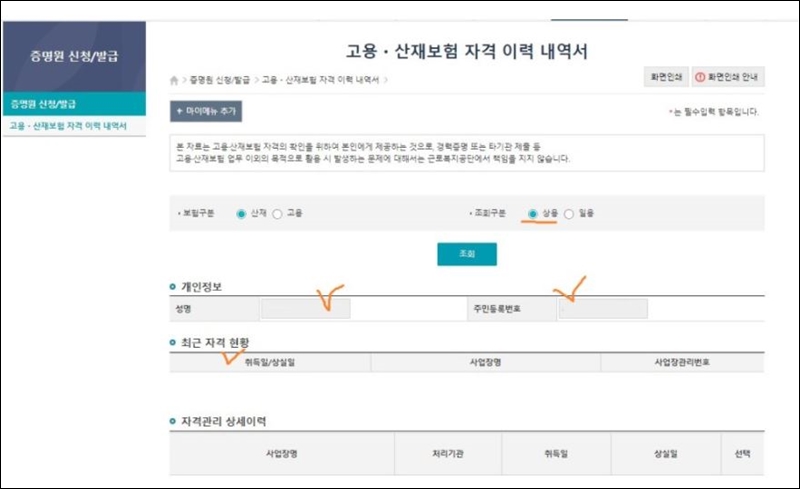 평소에는 로그인을 하면 예전에 보던 개인영역으로 들어갔습니다. 상단에 표시된 보험 이력서 버튼을 클릭합니다. 이후 홈> 증명서 발급신청> 고욘산보험 이력서로 이동했습니다. 여기에서 정확한 이름을 사용하여 실업 보험 이력을 표시해야 합니다. 그럼 고용보험 이력조회를 한번 해보실래요? 조회버튼 누르기 전에 보험을 산업재해와 고용보험으로 구분하고, 상무와 일용근로자를 따로 선택 후 조회버튼을 누르세요.