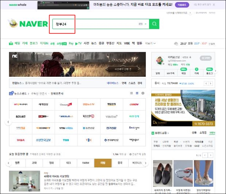 위 3가지 조건이 충족된다면 검색창에 "정부24"를 검색하세요. 이전에는 "민원24"에서 이름이 "정부24"로 변경되었습니다. "민원24"를 검색하여 "정부24" 홈페이지를 찾을 수도 있습니다.