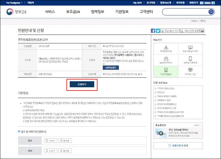 "신청하기"을 클릭하시면 발급 수수료는 400원이지만 인터넷에서 발급하면 무료임을 확인할 수 있습니다.