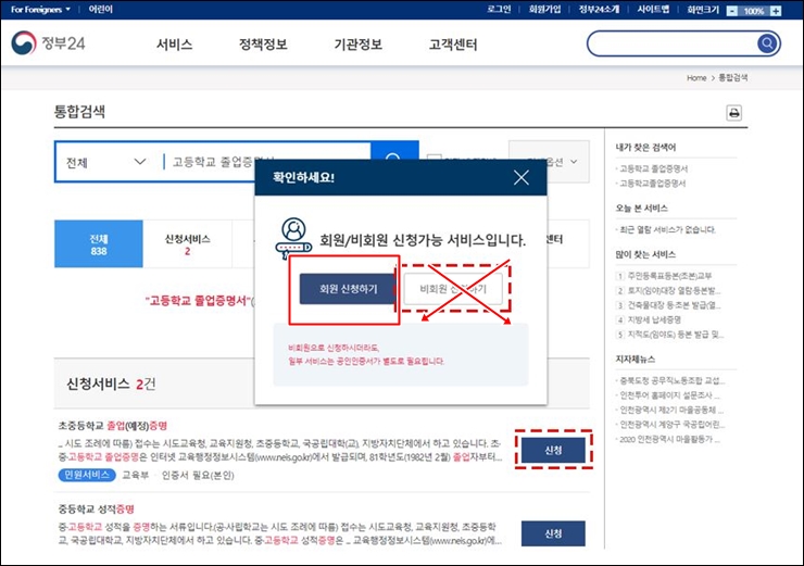 기존 회원의 경우 "회원가입"을 클릭하고 공동인증서를 입력하시면 민원신청 양식이 나오는데, 비회원의 경우 회원가입을 권장합니다. 수백 종의 민원서류를 받을 수 있는 이곳에서 "정부24" 회원으로 등록하면 어느 때나 다른 서류를 발급하는 것이 편리합니다.