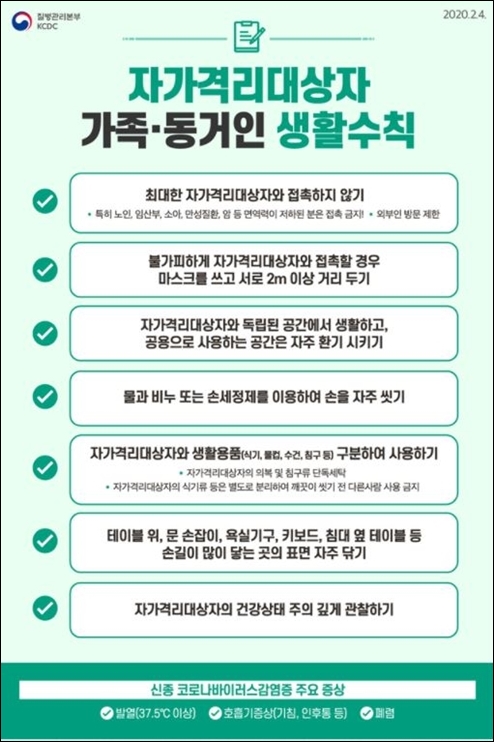 자가결리자의 경우 독립된 공간에서 혼자 살아야 한다. 환기가 잘 되도록 창문을 열어야 하고, 화장실과 세면대는 단독으로 사용하여 가족과 이웃에게 감염이 퍼지지 않도록 해야 합니다. 부득이하게 공동으로 사용하는 경우에는 소독제 또는 면도기로 소독해야 합니다.