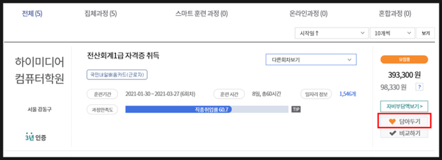 그럼 이렇게 제가 선택한 조건에 따라 들을 수 있는 훈련과정이 쭉 나옵니다.