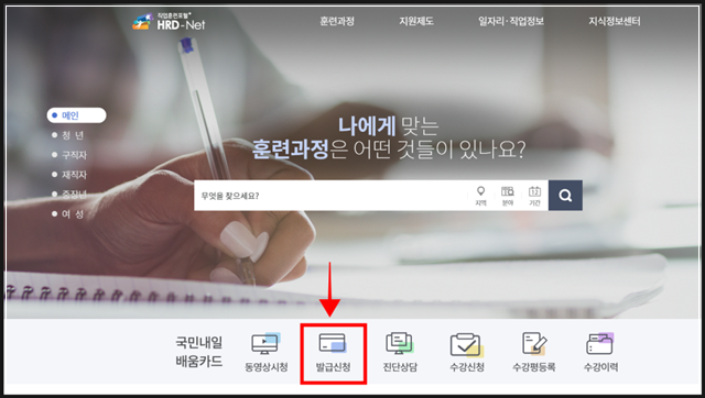내일배움카드는 고용노동부 Hrd-net에서 신청해줍니다. 워크넷인줄 알았는데 아님! 홈페이지 들어가면 바로 메인에 발급신청 버튼이 있습니다.