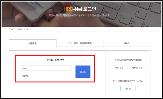 고용노동부 HRD-Net 접속 후 신청