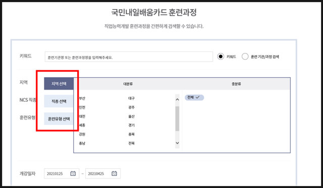 지역/직종/훈련유형과 개강일자를 선택해주고 선택항목 검색을 눌러줍니다.