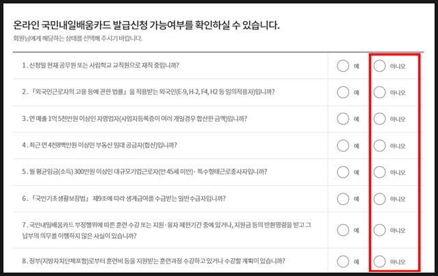 신청 제외 대상을 기준으로 질문이 작성되어서 모두 '아니오' 선택해줬습니다.
