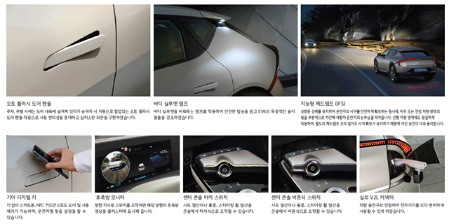 그밖에 최근 현기 신차에 적용되고 있는 오토 플러시 도어 핸들, 바디 실루엣 램프, 지능형 헤드 램프, 기아 디지털 키, 후측방 모니터, 센터 콘솔 터치 스위치 / 버튼식 스위치 등을 살펴볼 수 있고,